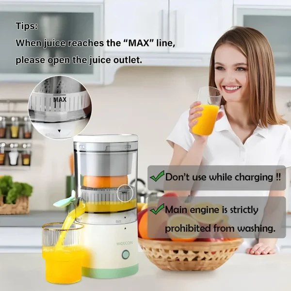 𝗪𝗜𝗥𝗘𝗟𝗘𝗦𝗦 & 𝗣𝗢𝗥𝗧𝗔𝗕𝗟𝗘 𝗗𝗘𝗦𝗜𝗚𝗡: The Electric Citrus Juicer Uses USB-C Technology for Charging. Take Our Wireless Orange Juicer to the Outdoor Camp and don’t worry about Running out of Power. Enjoy Delicious Juice Anytime and Anywhere with One Click.